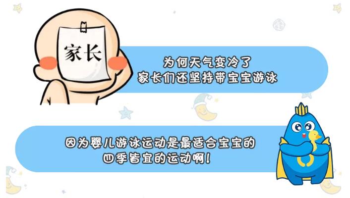 在气温较低的情况下,相比室外的跑跳运动,让宝宝出汗、着凉等,婴儿游泳是最舒适、温和的一种锻炼方式了。